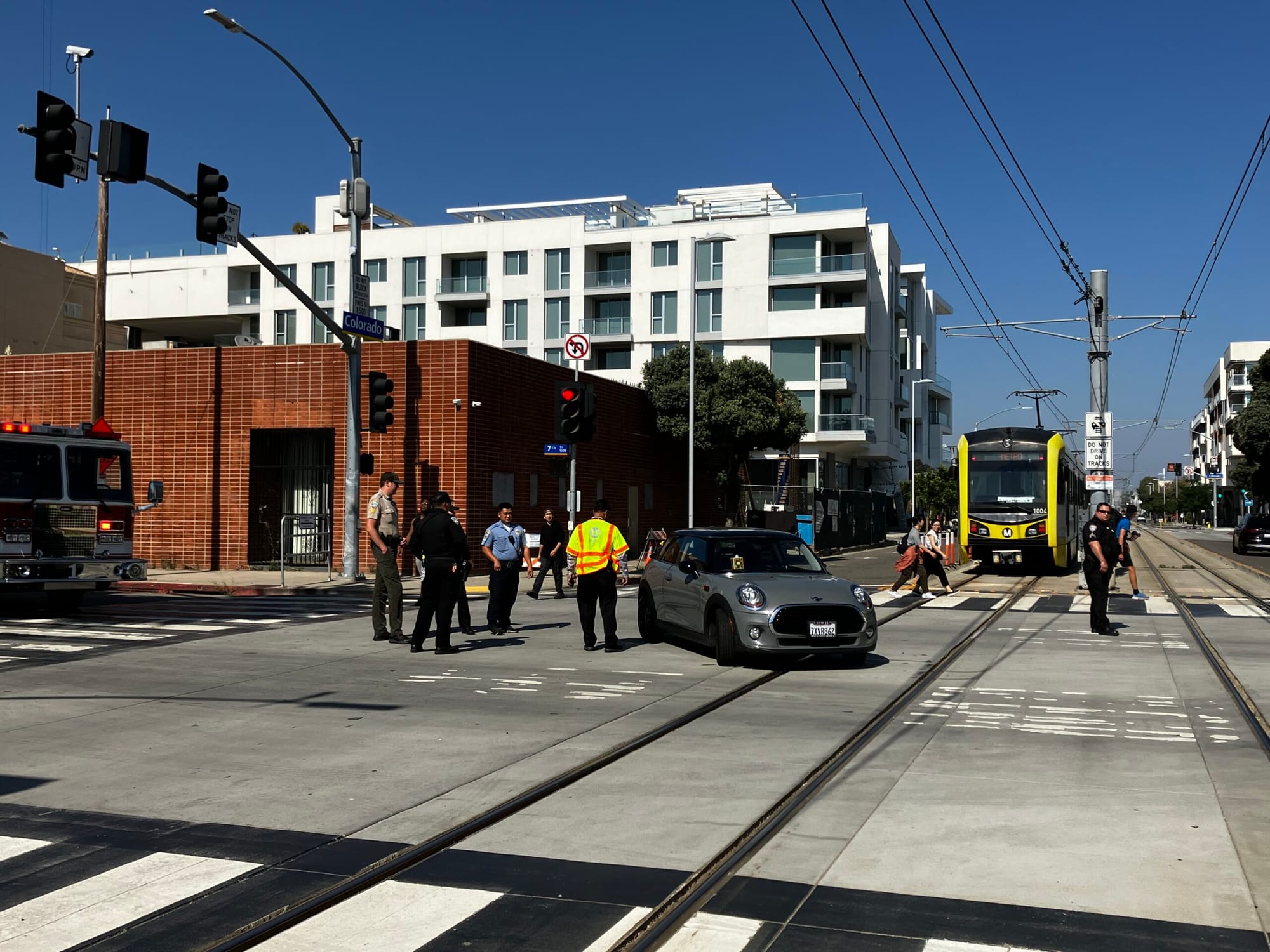 An official statement from the Santa Monica Police Department says that at about 3:52 p.m. an E Line train heading eastbound on Colorado was hit by a vehicle, possibly a grey sedan traveling southbound on 11th Street. The vehicle failed to stop at the red light and collided with the train. The sedan fled before PD arrived. There were no reported injuries and SMPD handled the incident report.