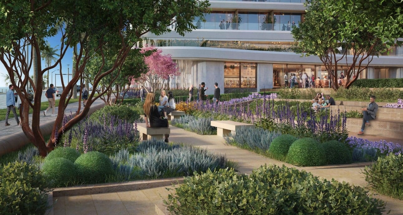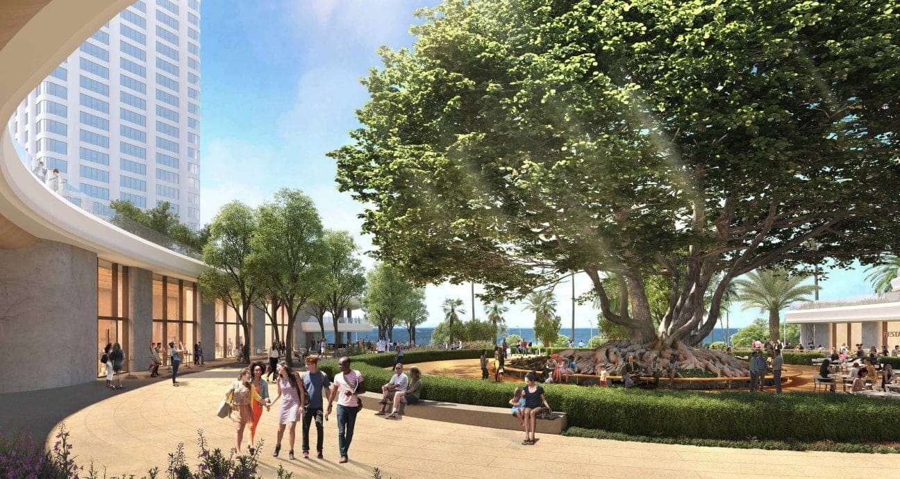 The Moreton Bay Fig Tree, the 80-foot-tall landmark planted by a sailor in the late 1800s, would become the "focal point of the site" with the redevelopment. The updated site plan, applicant Ocean Avenue LLC stated, "was designed to provide a pedestrian friendly open space network," and includes an approximately 14,000 square foot publicly-accessible space surrounding the tree, holding the Fig Tree Deck and the Miramar Gardens Terraces among other spaces.