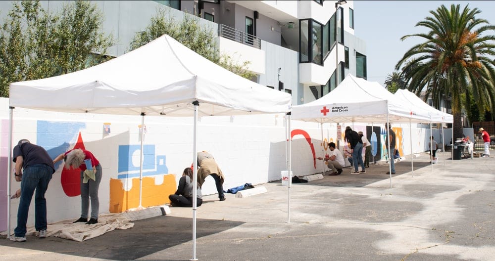 Another often overlooked site is the side of the Red Cross office in Santa Monica at 1450 11th Street. For over 20 years the parking lot wall was adorned with a faded, 140-feet-long mural painted in 2002, but local artist Boo Simms has given the exterior wall a facelift in an event that was deliberately aimed to coincide with a local community blood donation drive.