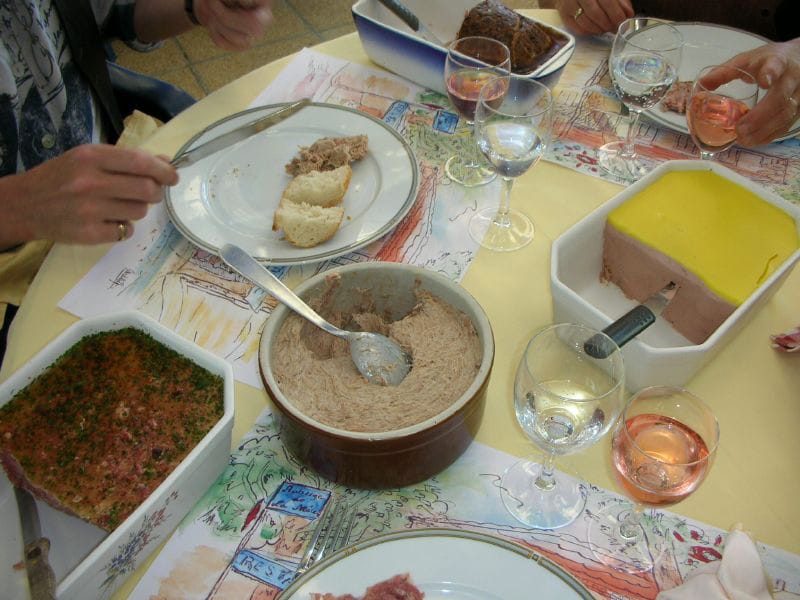 Why is it so famous? It's the food, stupid. A meal at the Auberge starts with the waiter bringing three or four huge terrines and setting them on the table alongside a basket of fresh bread. Patrons can count on terrines of either a duck or goose mousse, a pork rillette, a type of shredded meat cooked in its own fat, and a country pate. Also there might be another special of the day. You eat as much as you like. When the waiter senses that you are no longer digging into the terrines, he moves them to another table.