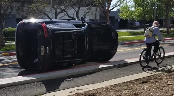 a photo widely circulated on social media shows a car flipped on its side next to the concrete barrier of the bike lane.