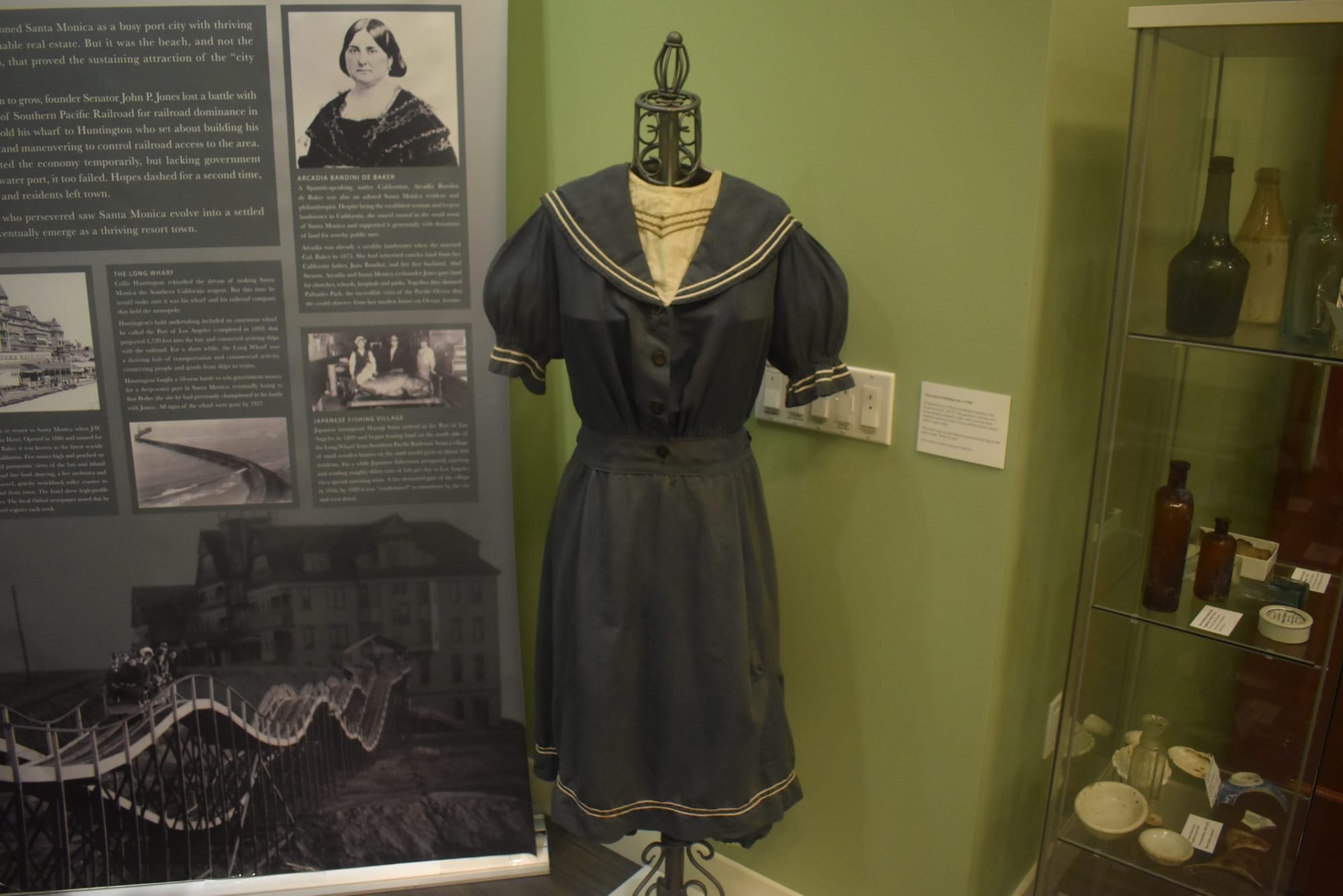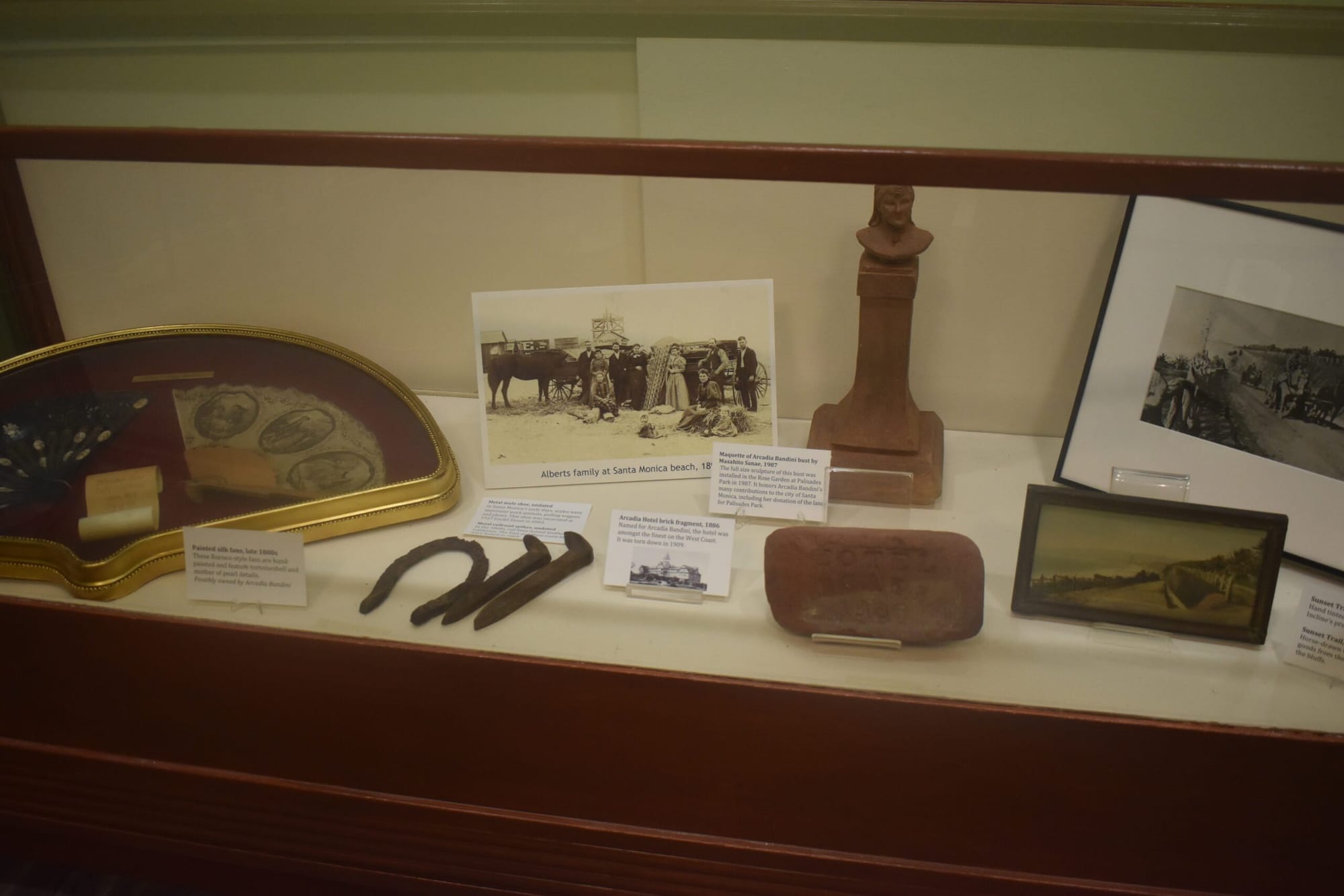 After rancho owners were forced to sell their lands due to losing cattle in severe droughts, entrepreneurs Col. Robert Symington Baker and Senator John Percival Jones were able to take over the Santa Monica lands and sold lots at auction in July of 1875. The first lots sold for between $75 and $500, and within nine months, the city had 1,000 people and 160 houses. The museum houses artifacts from this early Santa Monica era such as metal railroad spikes, metal mule shoes and an old photograph of the famous Arcadia Hotel in 1886.