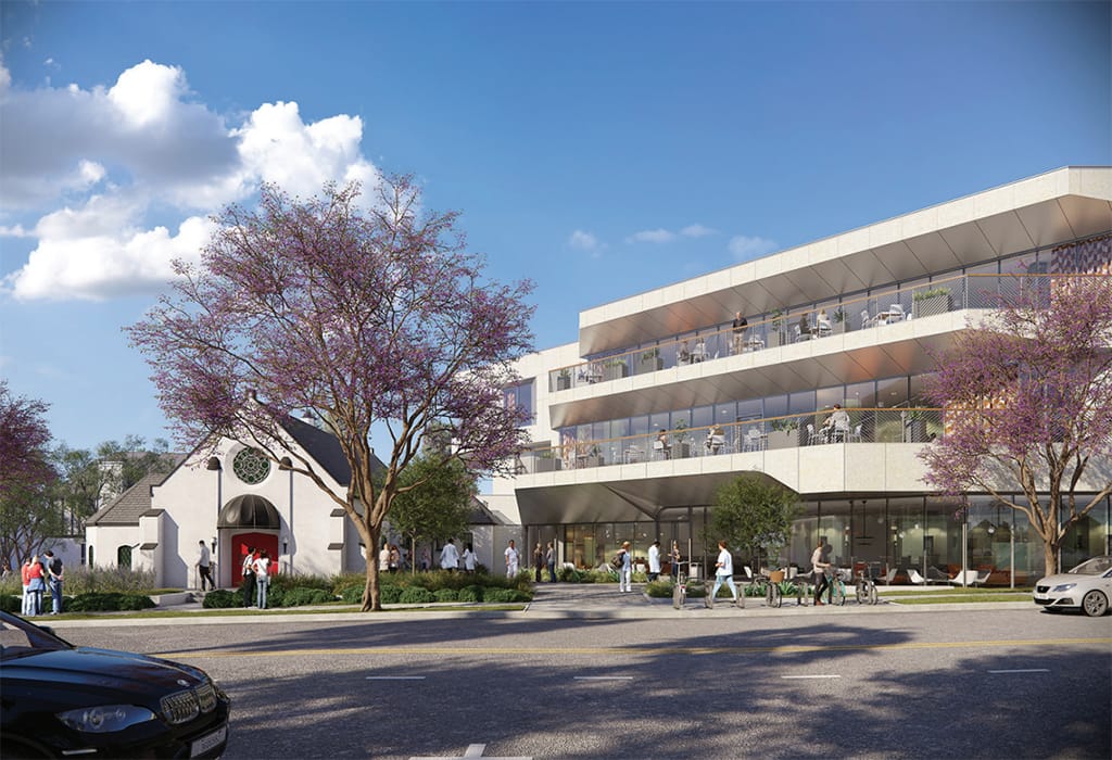 Gates, Kingsley, and Gates Mortuary (GKGM) funeral home used to occupy a Tudor Revival-style building on the property but the chapel portion was recently rehabilitated and converted into the Tartine bakery and full-service restaurant. Built in 1933, the existing two-story Tudor Revival-style building (GKGM) located at the street corner will remain in its current site configuration with its open front lawn area preserved.
