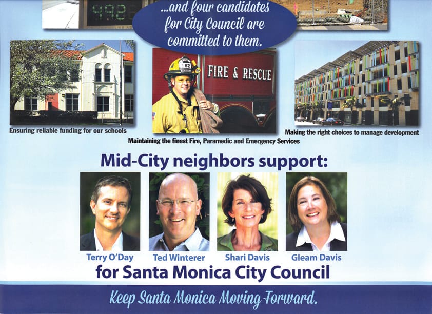 Gregg Heacock, president of the Santa Monica Mid City Neighbors, implored candidates Shari Davis, Ted Winterer, Gleam Davis and Terry O'Day to publicly denounce a mailer by Santa Monicans for a Responsible Future (SMURF) that read "Mid City neighbors support:" followed by the candidates' images and names.