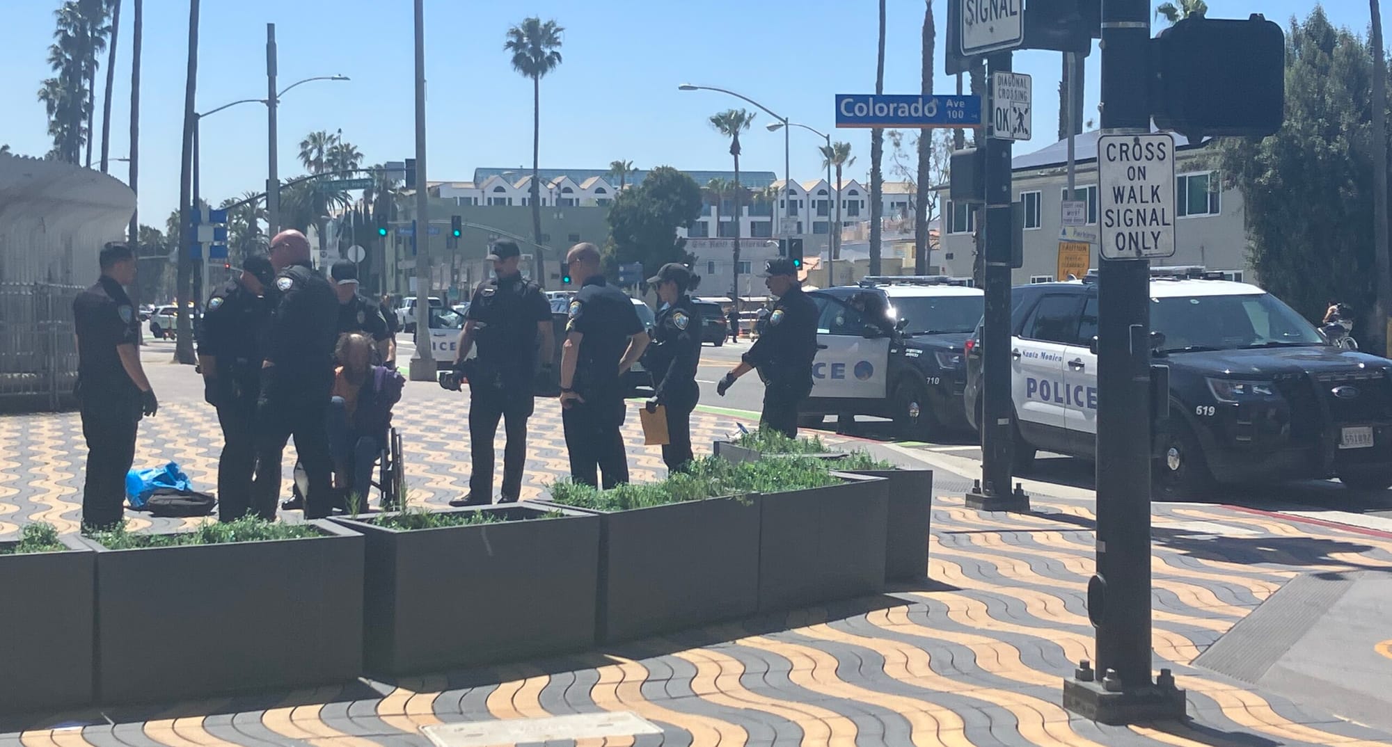 A section of the northbound lane of Ocean Avenue, opposite the Santa Monica Pier entrance, was shut down for approximately 45 minutes on May 7 as officers from the Santa Monica Police Department reacted swiftly to a homeless man acting in a severely irrational and threatening manner. According to a witness, at about 11am, while on the monthly Downtown Santa Monica, Inc. (DTSM) safety walk, the team consisting of DTSM Operations personnel, Legion Security, DTSM Outreach and members of the police department encountered an individual exhibiting anti-social behavior. According to the witness, when the team engaged the individual, he became agitated and threatening, picking up a knife and saying he was willing to kill members of the team. After a standoff, police took the individual down and into custody. The subject was being charged under California Penal Code 422 for threats against the security officer and outreach personnel.