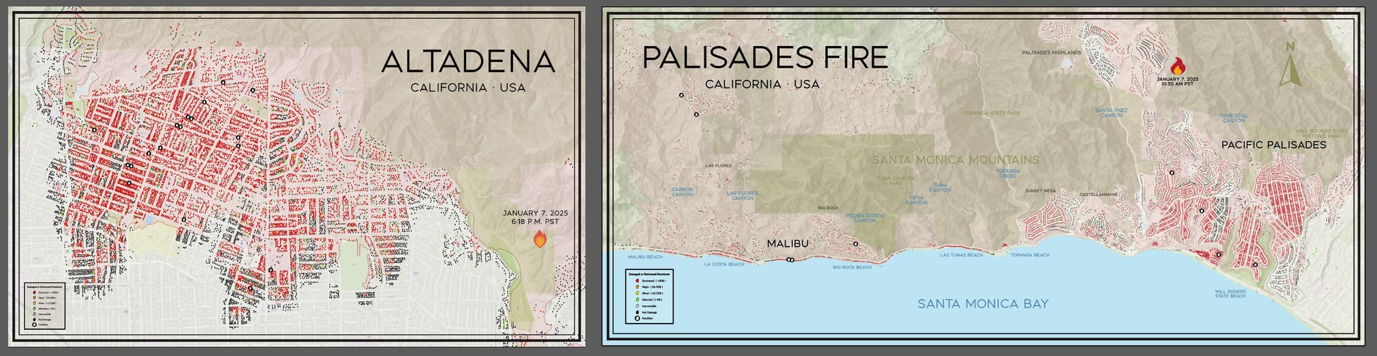 The design was pieced together from data compiled by Los Angeles County’s Recovers map, which tracks post-disaster damage assessments. Working with colleagues from the commercial production world, McCarthy took about five days to composite hundreds of screenshots into a massive digital file, then consulted with locals to get neighborhood names and landmarks right. “I'm not a Westsider,” he said. “So I relied on the folks at Heal the Bay and others in the community to make sure everything made sense for the people who live here.”