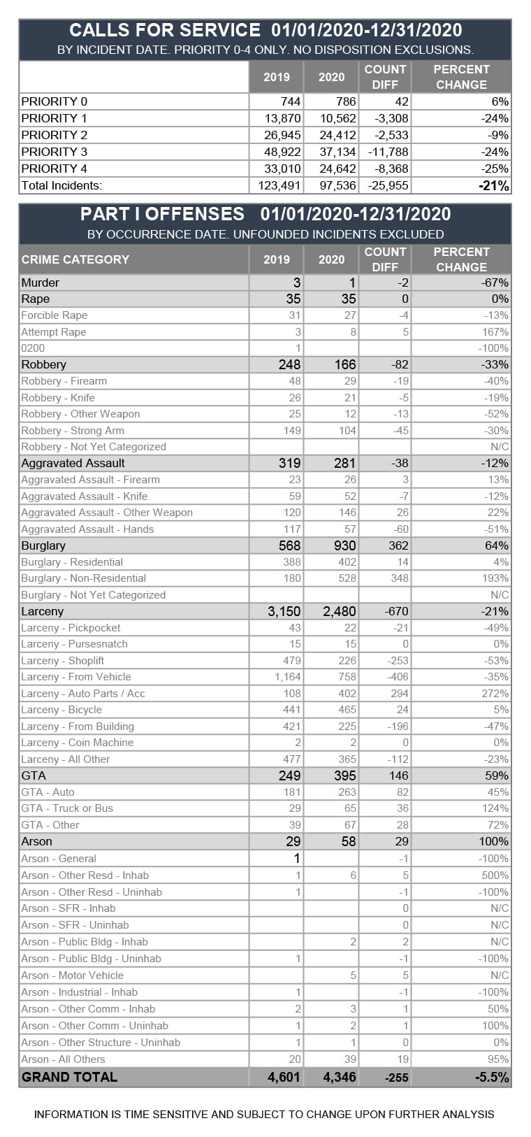 In addition to burglary, the theft of auto parts, specifically catalytic converters increased 272 percent due to the increased opportunity for theft with cars parked for extended periods of time. There were 19 additional arsons in 2020 (a 95% increase).