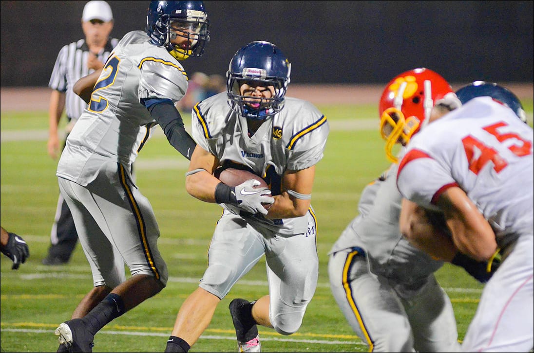 Santa Monica’s Nick Cardiel runs for a gain during a 42-0 rout of Hawthorne at Santa Monica College’s Corsair Field on Friday. The win gives Samohi a 5-0 record in the Ocean League, securing the second straight championship for the Vikings.