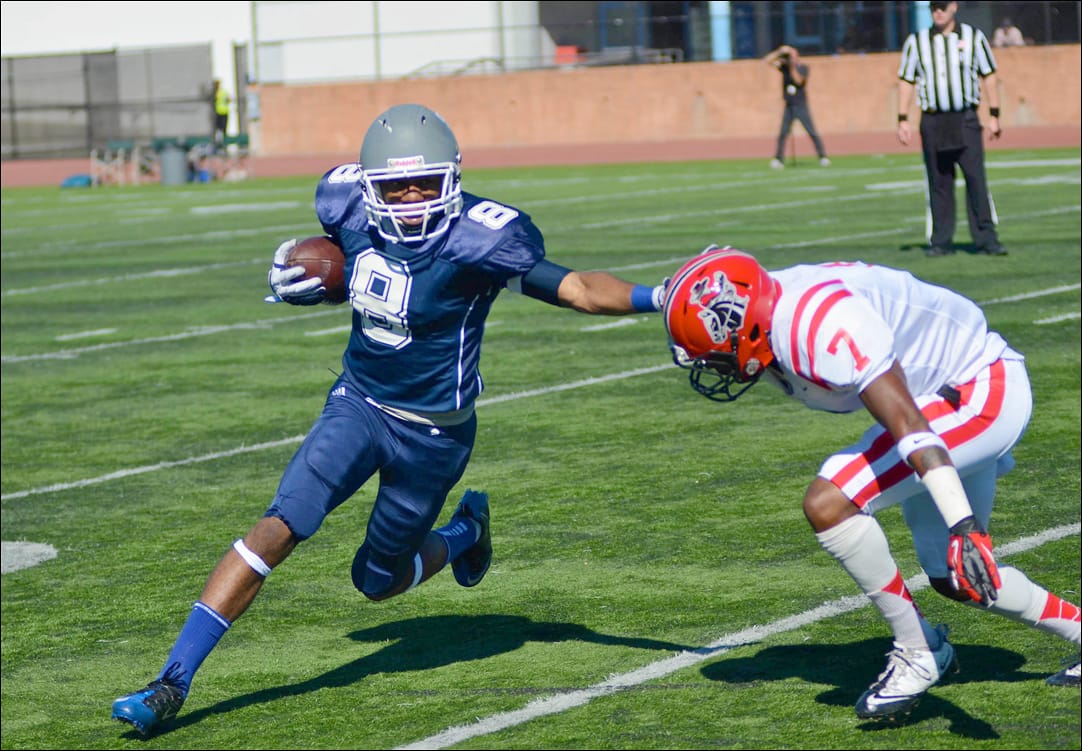 Santa Monica College’s Reggie Mitchell stiff-arms Delency Parham of Santa Barbara City College at Corsair Field on Saturday during a 41-27 SMC victory.