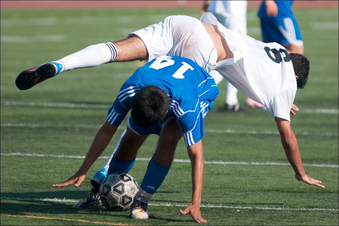 Santa Monica College’s Luis Sanchez (center) gets tangled up with Glendale College’s David Matriosyan on Tuesday at Corsair Field. SMC won the game, 4-1, improving to 6-0-2 this season.