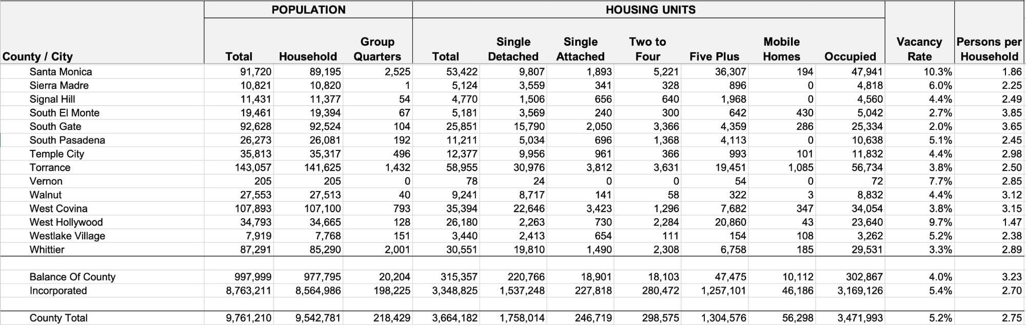 According to the State, Santa Monica’s 2023 population was 91,720 with a total of 53,422 housing units for an average household size of about 1.86. Of those units 47,941 are occupied for a vacancy rate of 10.3 percent. Of the total housing units, the Department of Finance figures report 11,700 are "single" units, 194 are mobile homes with the rest in multi-unit properties.