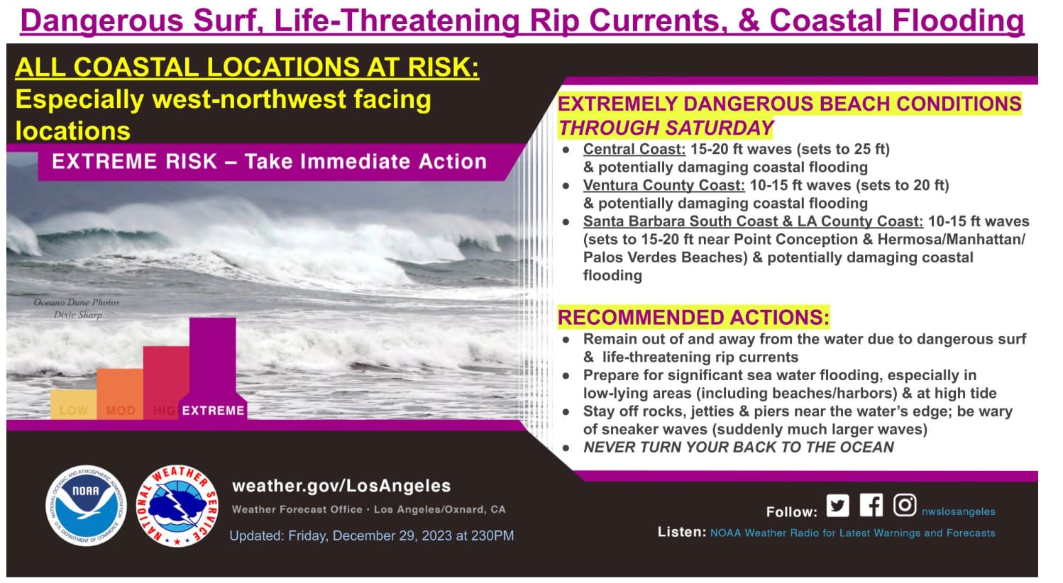 The Los Angeles-area weather office wrote that powerful cyclones over northern Pacific waters were sending 12- to 17-foot (3.6- to 5-meter) swells, creating "tremendous wave energy across coastal waters."