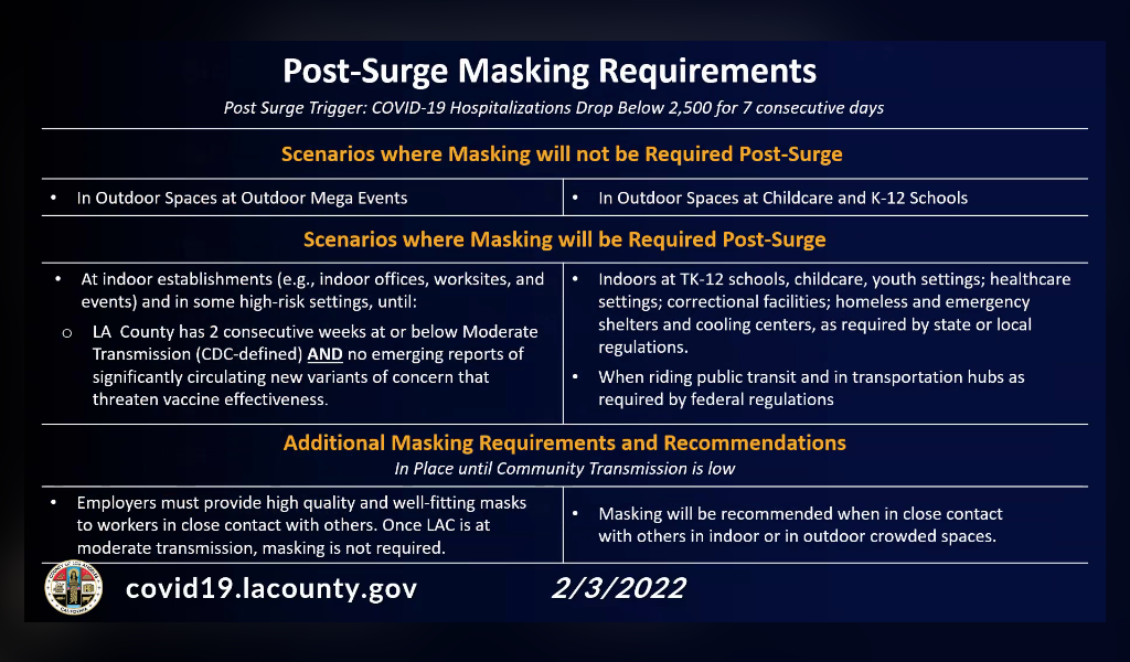 Ferrer defined the post surge phase as when the County records less than 2,500 hospitalizations for seven consecutive days. At this times masks will no longer be required outdoors at mega events or at outdoor spaces where masking is currently required such as childcare and K-12 schools.