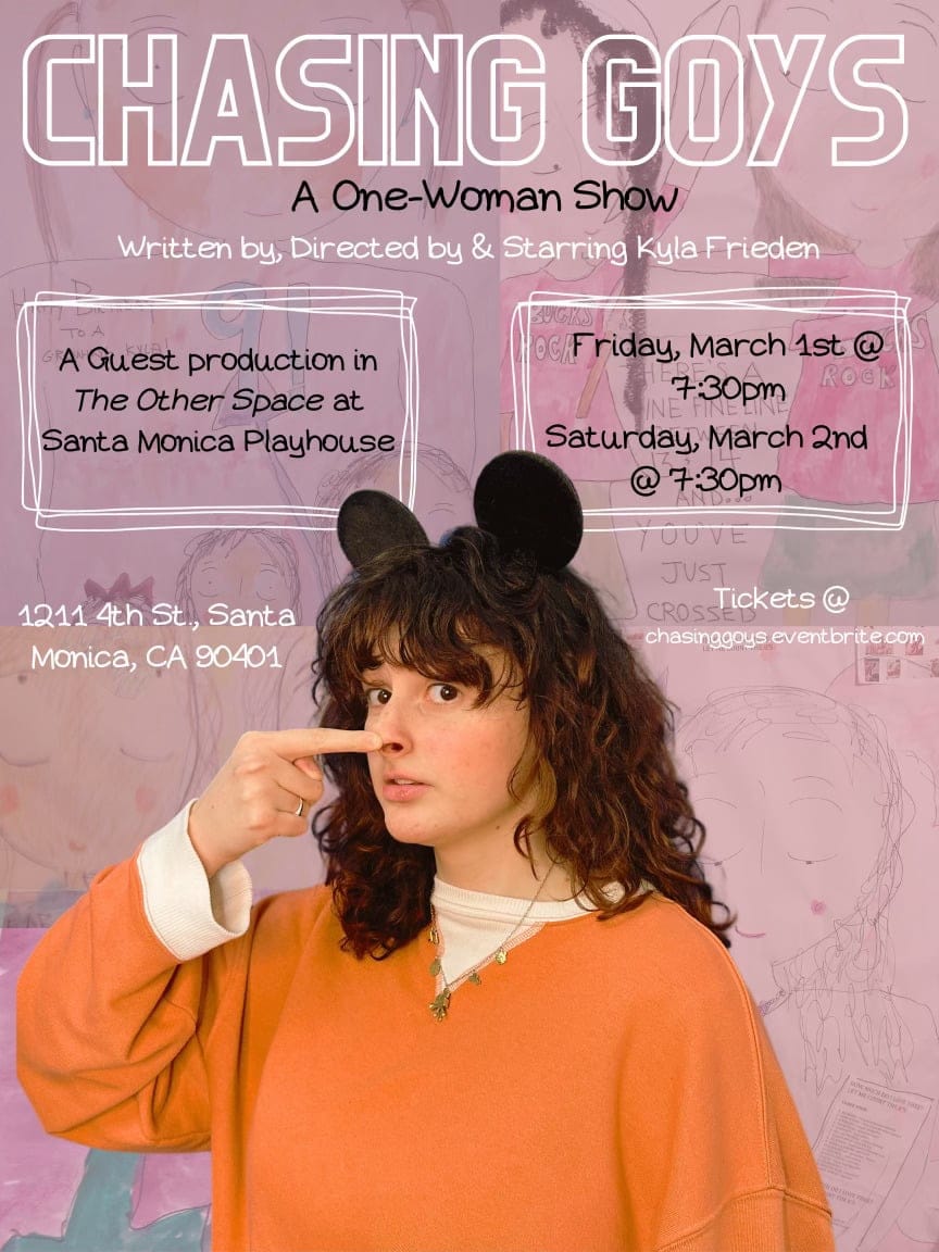 On Friday and Saturday evening, Kyla Frieden will lay bare her tribulations and successes at the Santa Monica Playhouse for her one-woman show Chasing Goys, a twisted tribute to her childhood relying on theatrical cues and mixed media messages from her time on stage and in film production. Beginning at 7:30 p.m. each night, Frieden will share the "culmination" of two years spent in Los Angeles by getting back to the stage setting she loves, espousing tales of her childhood crushes and relationships with her family.