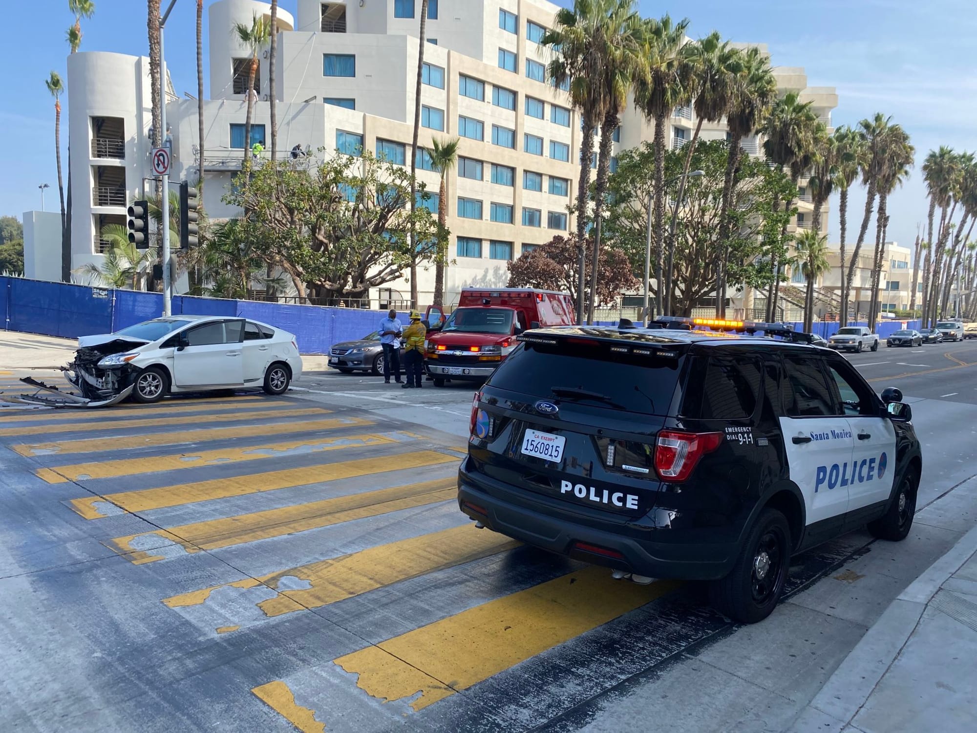 First responders arrived at the intersection right outside of the Santa Monica Police Department station around 12:30 p.m. to assist the drivers of a Prius and sedan as Santa Monica Patrol and Traffic Services Officers worked to divert traffic in the area.