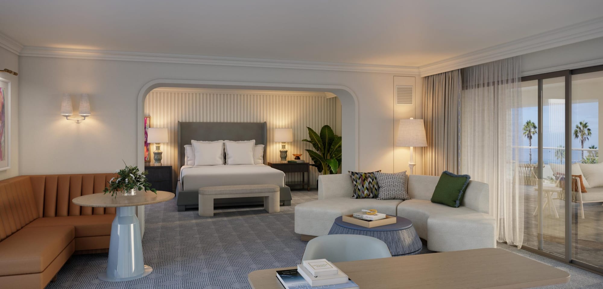 According to the hotel, the resort will offer a total of 34 different suites, including a 2,180 sq-ft, two-story atrium suite offering ocean-facing views. However, the Santa Monica Presidential Suite on the eighth floor will offer the largest space, incorporating a game room, separate living room area and four Juliet balconies.