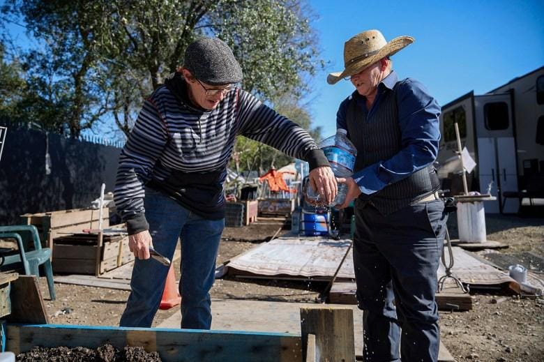Camp Resolution, as the Sacramento camp is known, was started in 2022 by Sharon and Joyce Jones — a married couple in their 50s who found themselves homeless for the first time late in life. More than four-dozen people now live there, some in new-looking Bullet trailers provided by the city, and others in cars, tents and more dilapidated trailers and RVs.