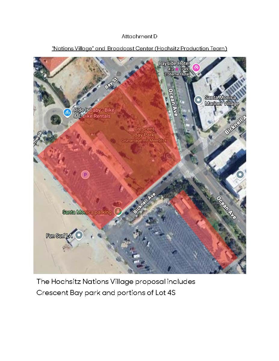 Separately, LOIDL LLC, operating as Hochsitz, proposes developing a "Nations Village" and international broadcast hub at Crescent Bay Park and portions of Lot 4 South. The 103-day occupation would span both Olympic and Paralympic periods, hosting broadcast studios serving official media partners, hospitality houses for participating nations and premium brand activations.