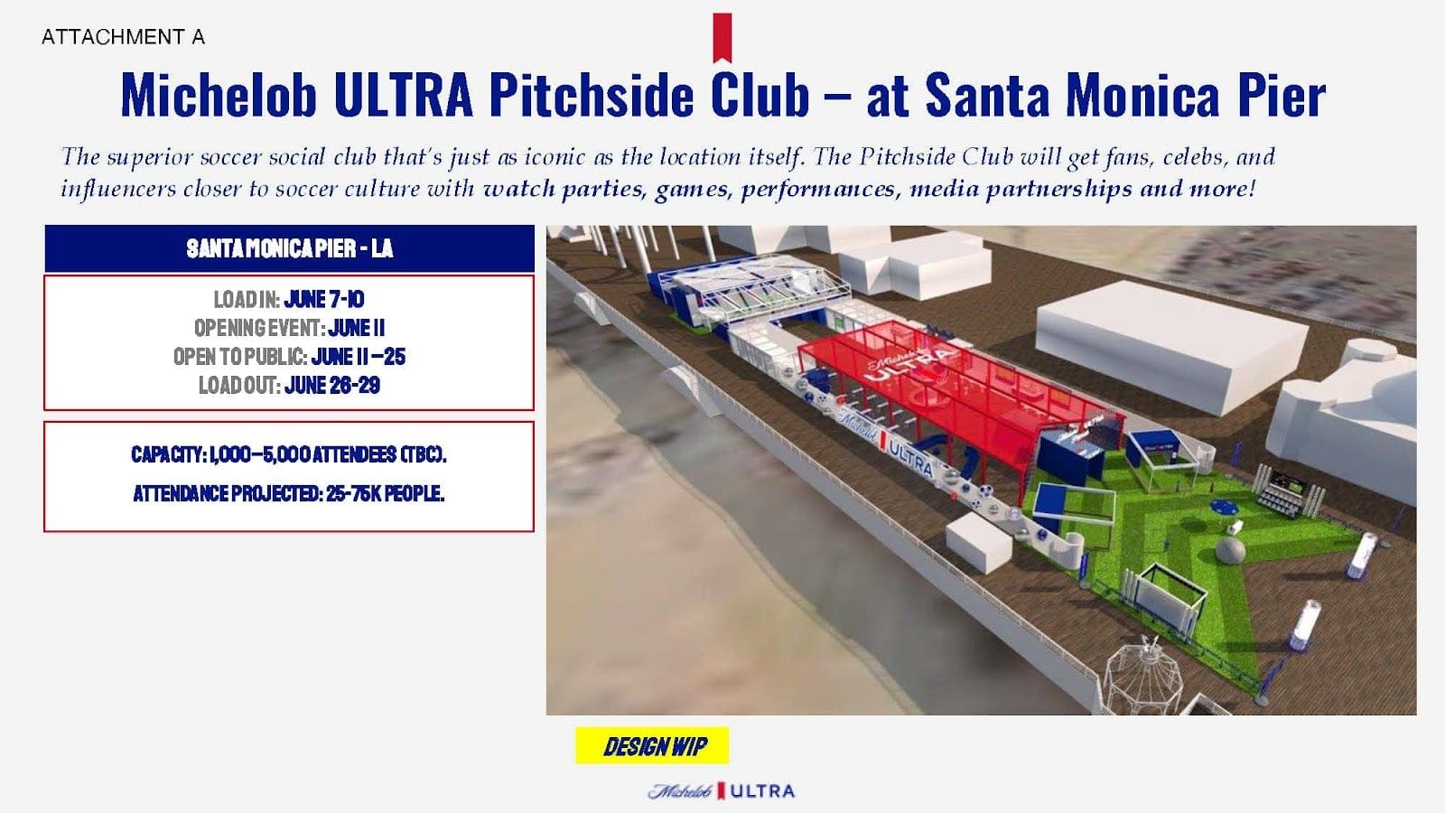 Anheuser-Busch's Michelob ULTRA brand proposes bringing its "Pitchside Club" fan experience to the Santa Monica Pier for approximately three weeks in June 2026, coinciding with FIFA World Cup matches in Los Angeles.