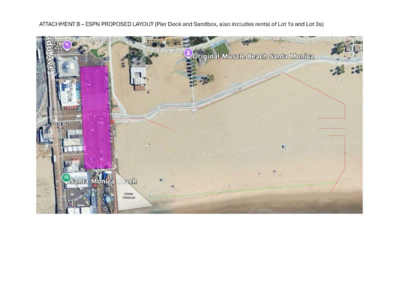 ESPN would occupy the Pier deck and beachfront area south of the Pier with temporary production structures, broadcast stages and controlled public-access zones.