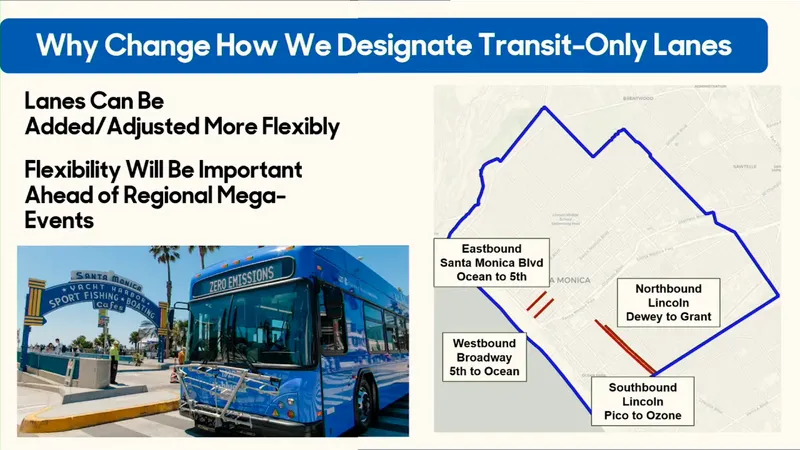Santa Monica currently operates four transit-only lanes: peak-time lanes on Lincoln Boulevard and all-day lanes on Santa Monica Boulevard and Broadway.
