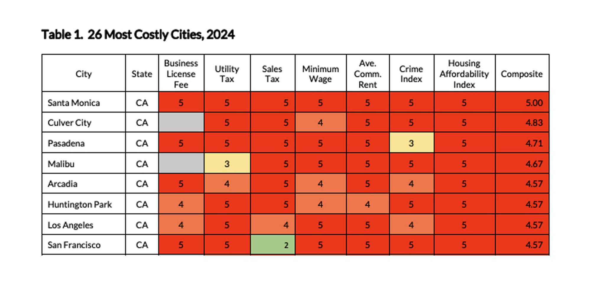 The report ranked cities into five tiers for business costs, including taxes, fees, wages, and rents. Santa Monica fell into the worst tier in every category for a composite score of 5. Close behind was Culver City which earned a “5” in most categories but achieved a “4” for Minimum Wage. Pasadena, Malibu, Arcadia, Huntington Park, Los Angeles, San Francisco, Burbank and South Pasadena rounded out the top 10.