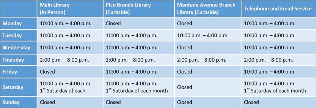 The Montana Avenue and Pico branch libraries will remain closed to the public for now, but continue to offer curbside pickup throughout the summer. The public library team is working with the City to increase funding for more staff members under its next budget.