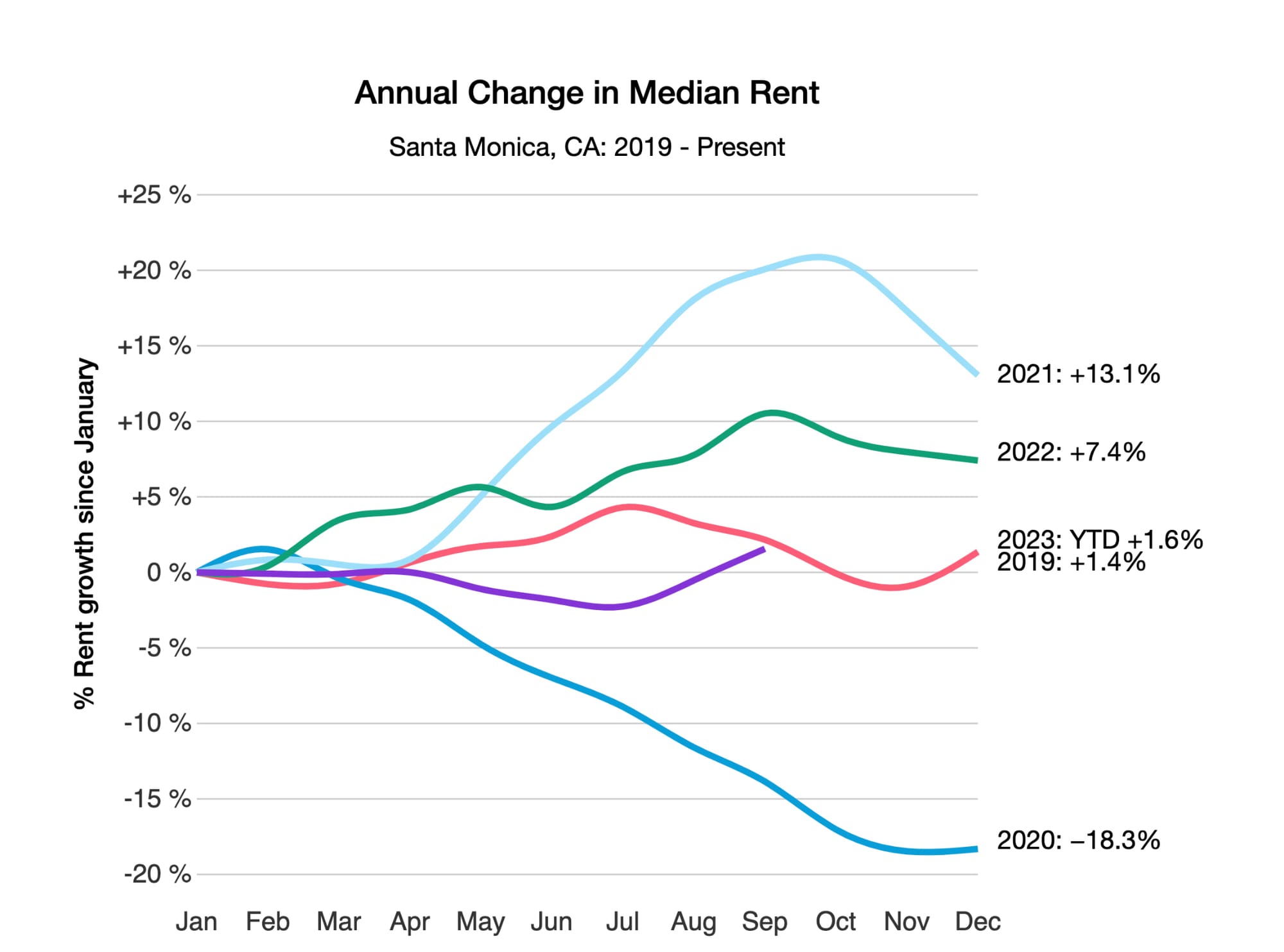 Nine months into the year, rents in Santa Monica have risen 1.6%. This is a slower rate of growth compared to what the city was experiencing at this point last year: from January to September 2022 rents had increased 10.5%.