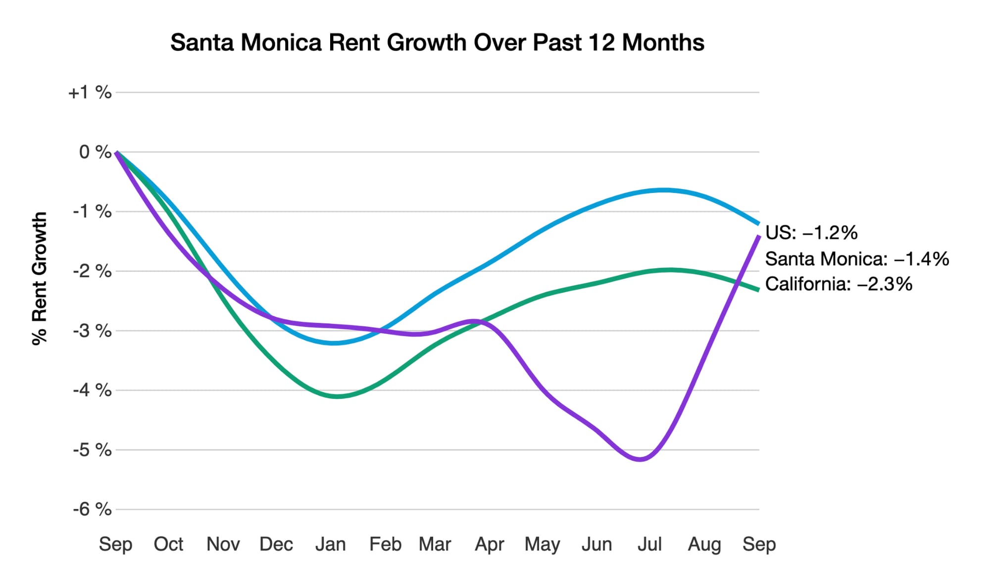 The median rent in Santa Monica rose by 2.1% over the course of September, and has now decreased by a total of 1.4% over the past 12 months. Santa Monica’s rent growth over the past year has been similar to both the state (-2.3%) and national averages (-1.2%).