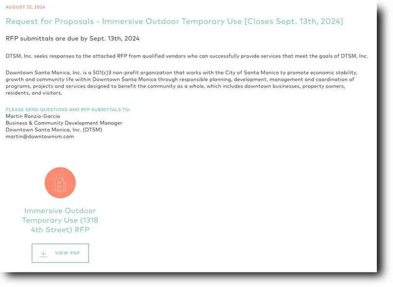 A Request for Proposals (RFP) appeared on the DTSM website late last week, for "Immersive Outdoor Temporary Use (1318 4th Street)" — the address of the Parking Structure 3 site.
