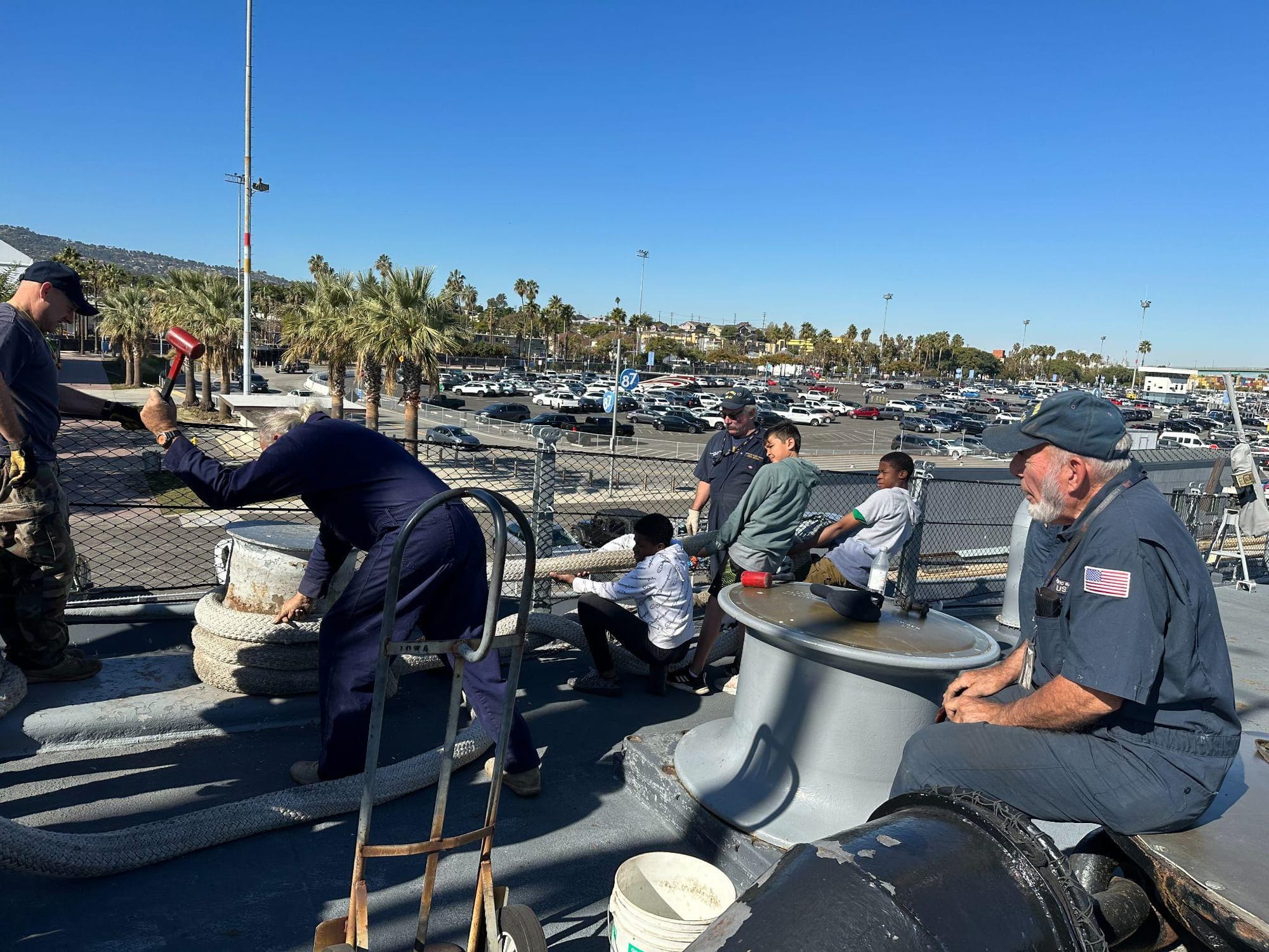 We first arrived on the Harbor as we group with Ms. Schmidt (Sue Schmidt) who helped us with the volunteering process. We were able to go on this huge vessel. A part of maintaining an approximately 48,000 ton ship is keeping it secured to the harbor. We were working on whatever the tasks were given. Our main task that day was to help in hoisting the lines. The patrol did a great job being employed in the arduous task of pulling a heavy rope and thick rope. With a series of ‘’heaves’ ‘ we pulled the line in a sort of Tug-of War and the rope was hammered into the cylinder after being pulled to its tightest with the patrol pulling very strongly. The crew complimented us our efficient work. We enjoyed doing this task!
