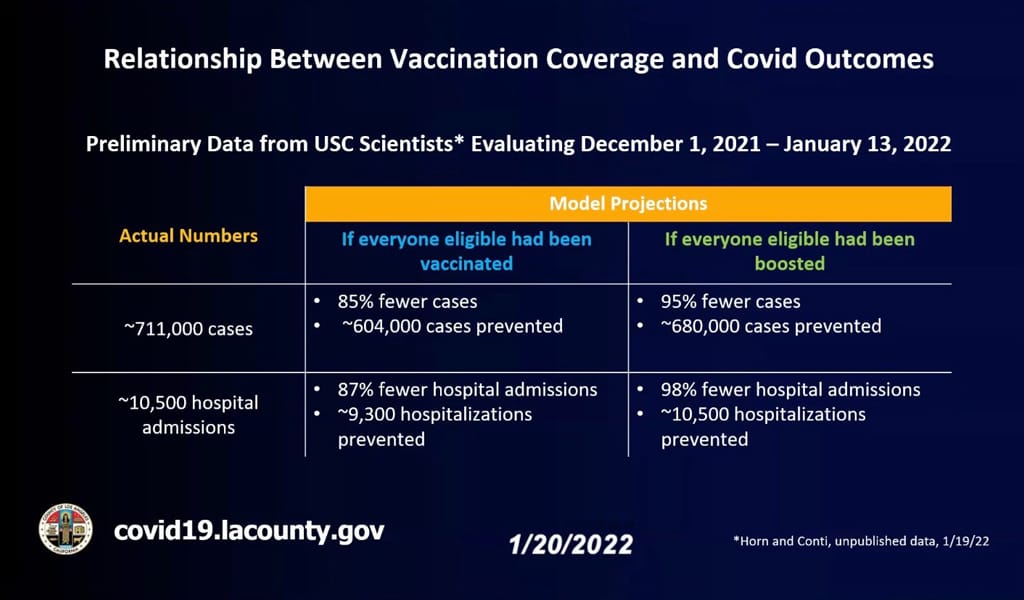 Full vaccinations for all eligible Angelenos would have resulted in 87 percent fewer hospitalizations in that time period, according to the model; when it came to boosters, the model predicted there would have been 96 percent fewer cases and 98 percent fewer hospitalizations had every eligible Angeleno received a booster shot.