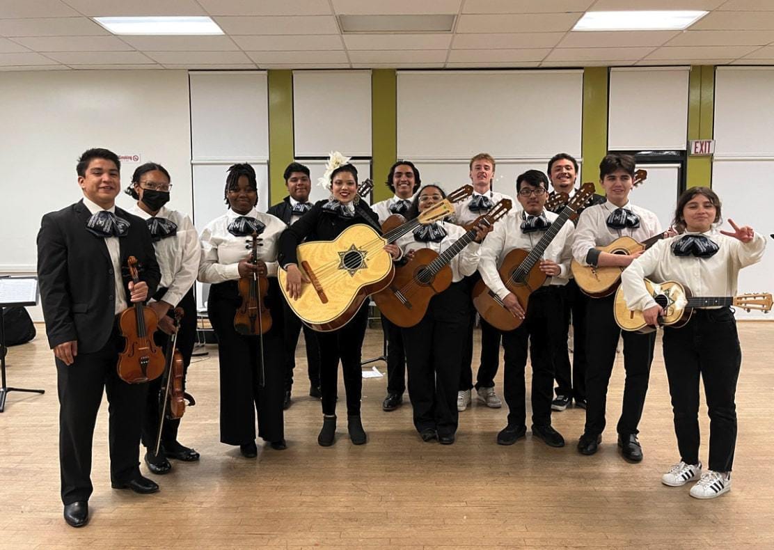 Mariachi instruments like violins and trumpets are in the mix for the class, though many instead choose a guitar, such as the high-pitched vihuela and the acoustic bass guitarrón, due to just joining into a music ensemble for the first time. The guitar technique, Alfaro added, involves much strumming in a rhythmic manner, a good way to get students up to speed.