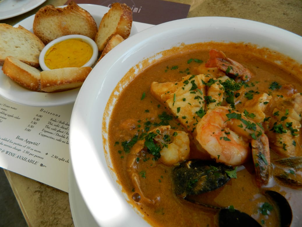 I had the onion soup, and it was wonderful. On another occasion I had the bouillabaisse, and it too was wonderful. It reminded me a bit of Noah's Ark: there were two scallops, two shrimp, two pieces of white fish, etc. But it was the concentration of the broth that made it wonderful, plus the spicy aioli, which must be more Canadian than French since the French usually have more garlic and less red pepper. I like the red pepper.