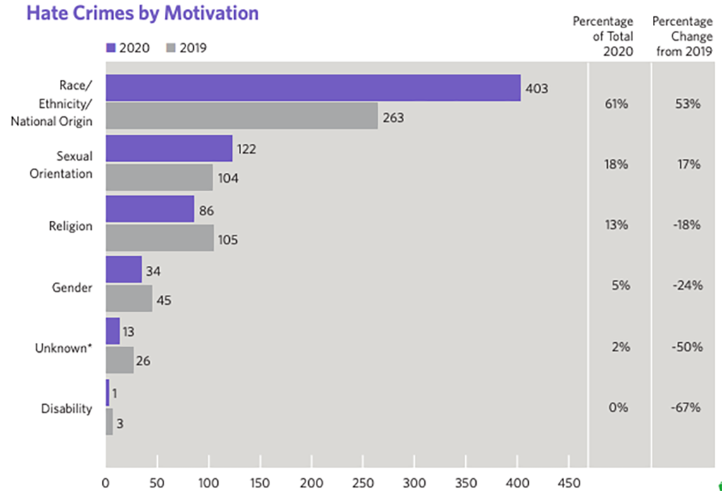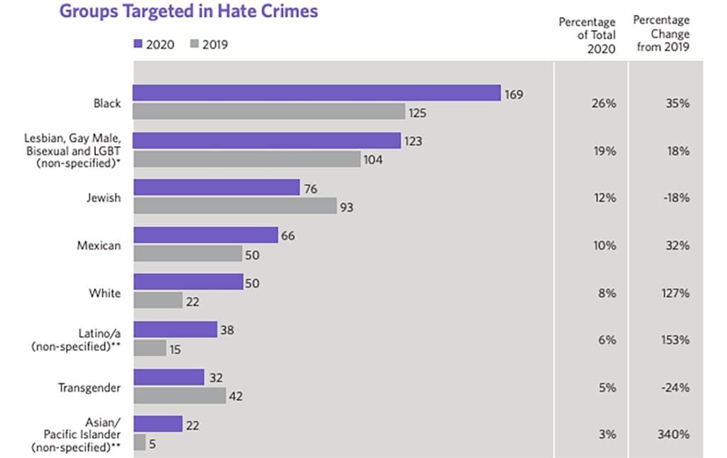 Of all groups experiencing hate crimes, transgender individuals experienced violence at the highest rate, which was 94 percent. Fortunately, there was a 24 percent decrease in anti-transgender crimes in 2020, which dropped from 42 to 32 incidents, although it was still the third highest number ever recorded.