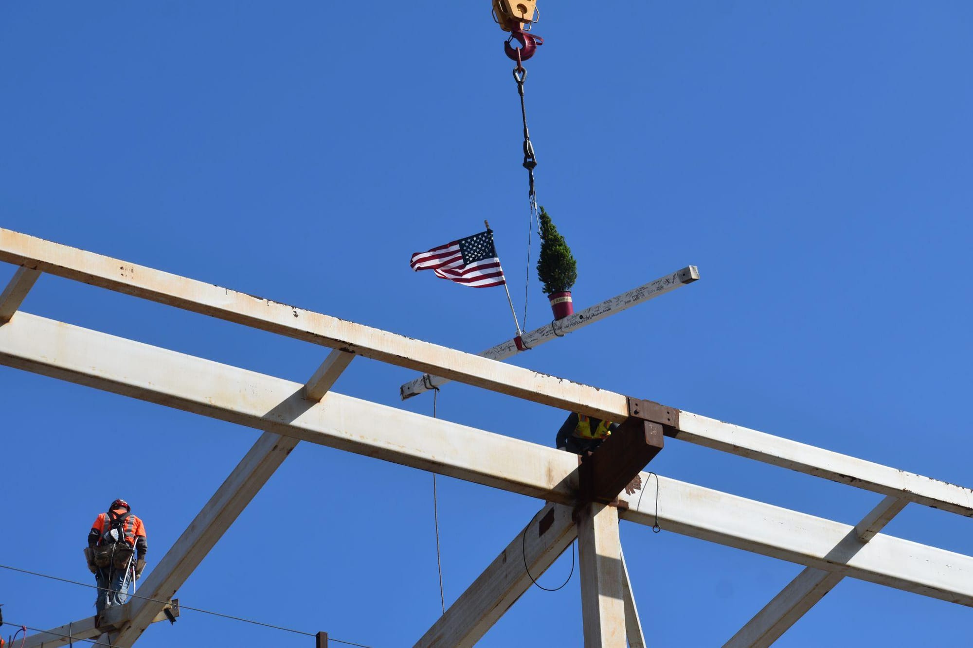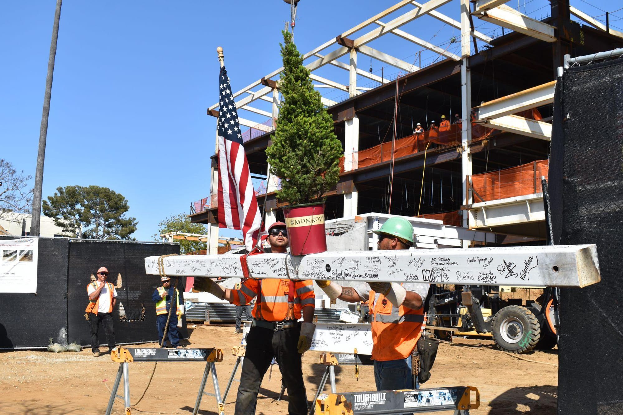 Eight months after construction began on the Exploration Building and Gold Gymnasium on the Santa Monica High School Campus, SMMUSD community members gathered to celebrate the completion of the buildings’ frames. In keeping with a centuries old Scandinavian tradition, the final steel beam of each building was lifted into place, topped with an evergreen tree meant to symbolize that the building has reached its final height and serve as a good luck charm, according to Project Director Nathan Huntley of McCarthy Builders.