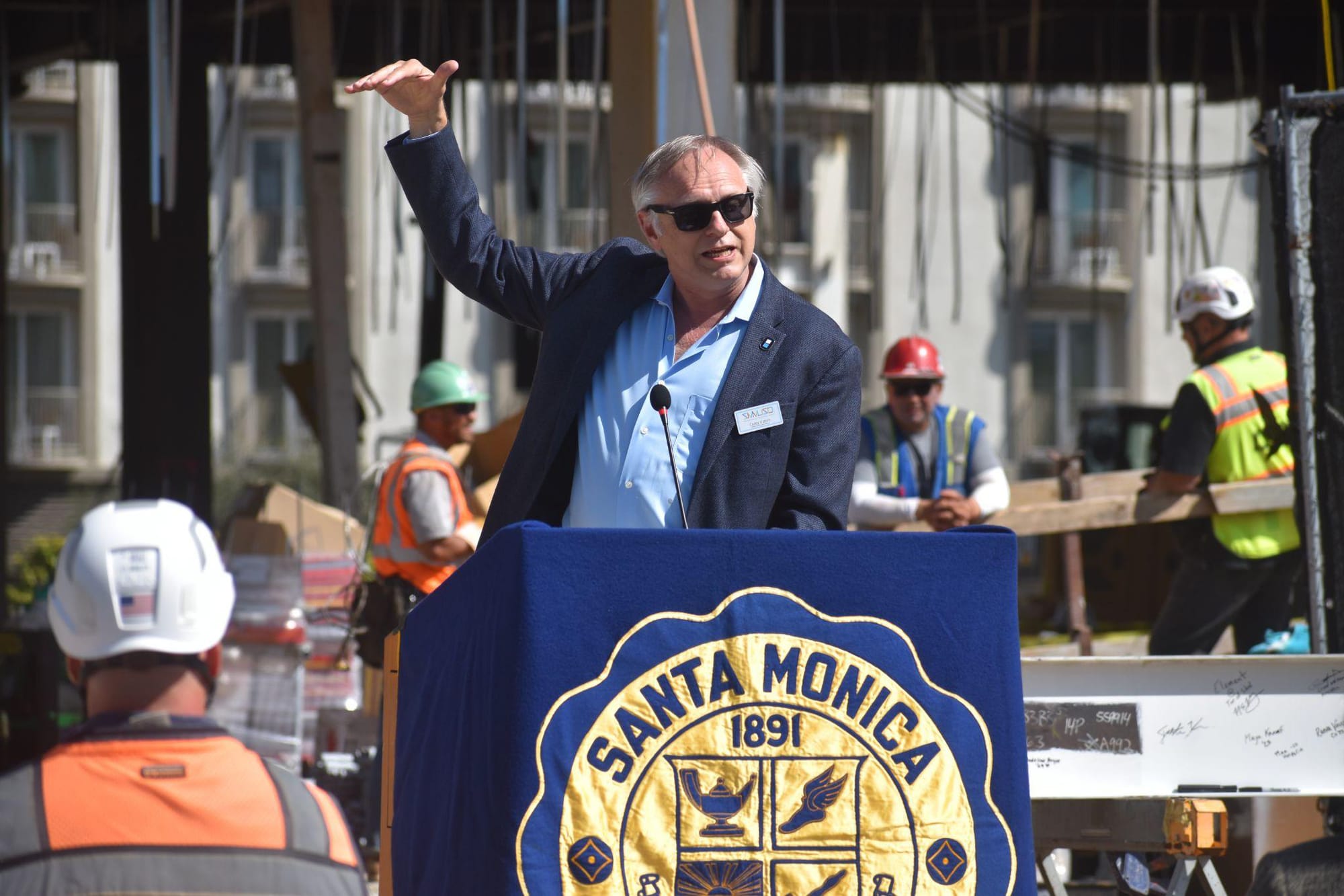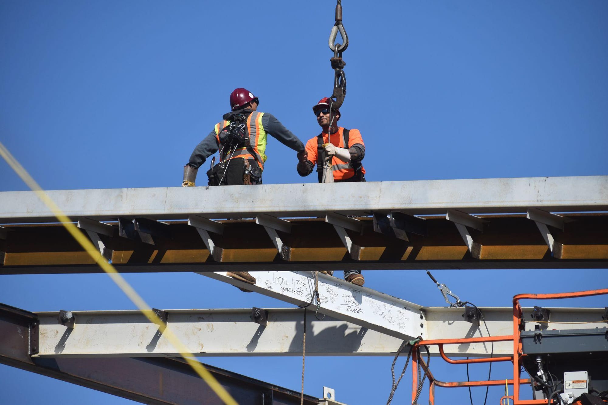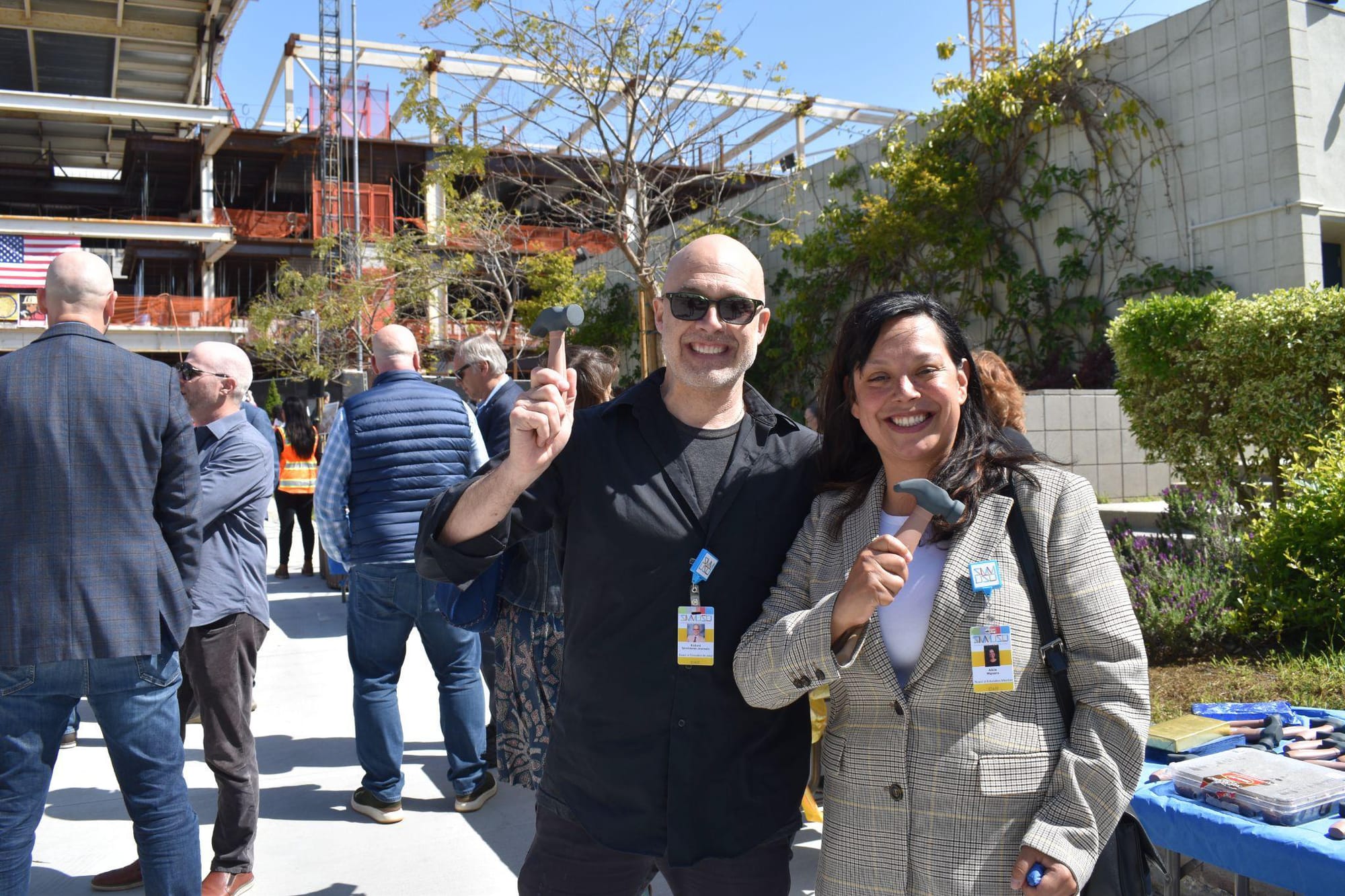 Eight months after construction began on the Exploration Building and Gold Gymnasium on the Santa Monica High School Campus, SMMUSD community members gathered to celebrate the completion of the buildings’ frames. In keeping with a centuries old Scandinavian tradition, the final steel beam of each building was lifted into place, topped with an evergreen tree meant to symbolize that the building has reached its final height and serve as a good luck charm, according to Project Director Nathan Huntley of McCarthy Builders.