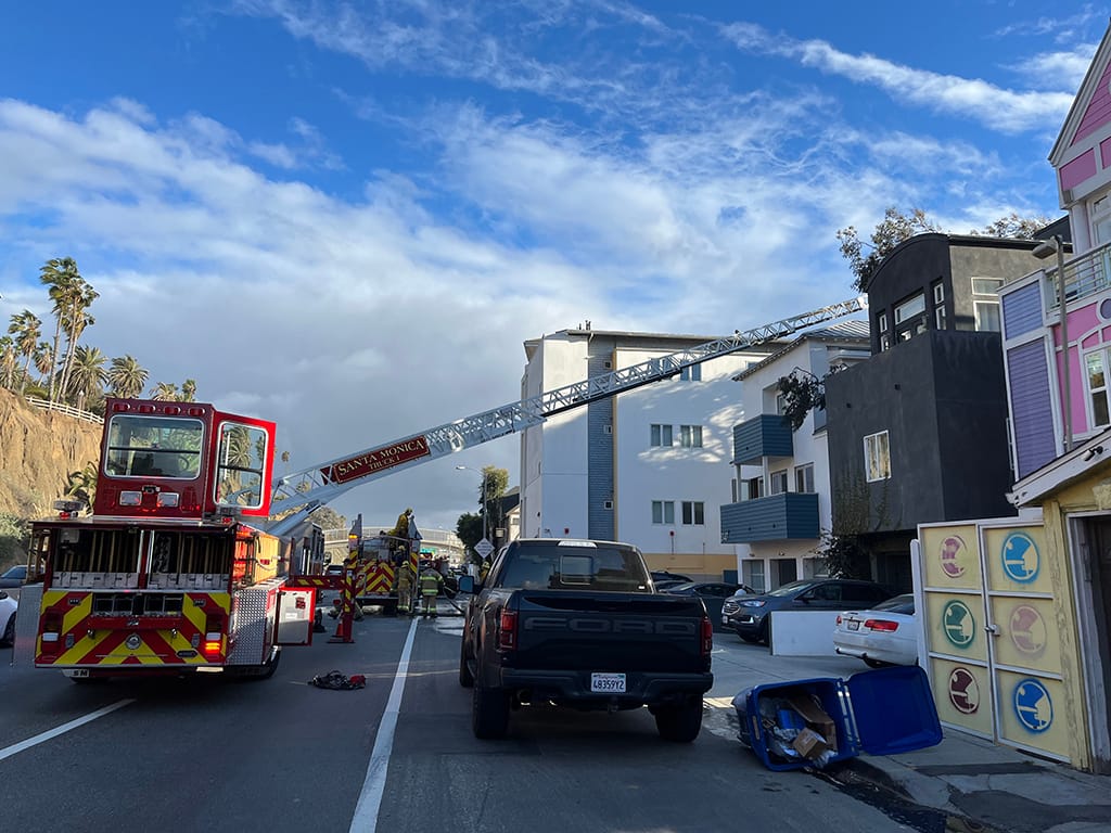 PCH: Santa Monica Fire Department responded to a structure fire call in the 1300 block of Palisades Beach on Tuesday afternoon, Feb. 2. The response included a ladder truck, three engines and a support vehicle, plus McCormick Ambulance Service and Santa Monica Police Department. Pacific Coast Highway was down to one lane heading southbound just north of the McClure Tunnel, with traffic backed up past Temescal Canyon Road. There were no immediate reports of injuries.