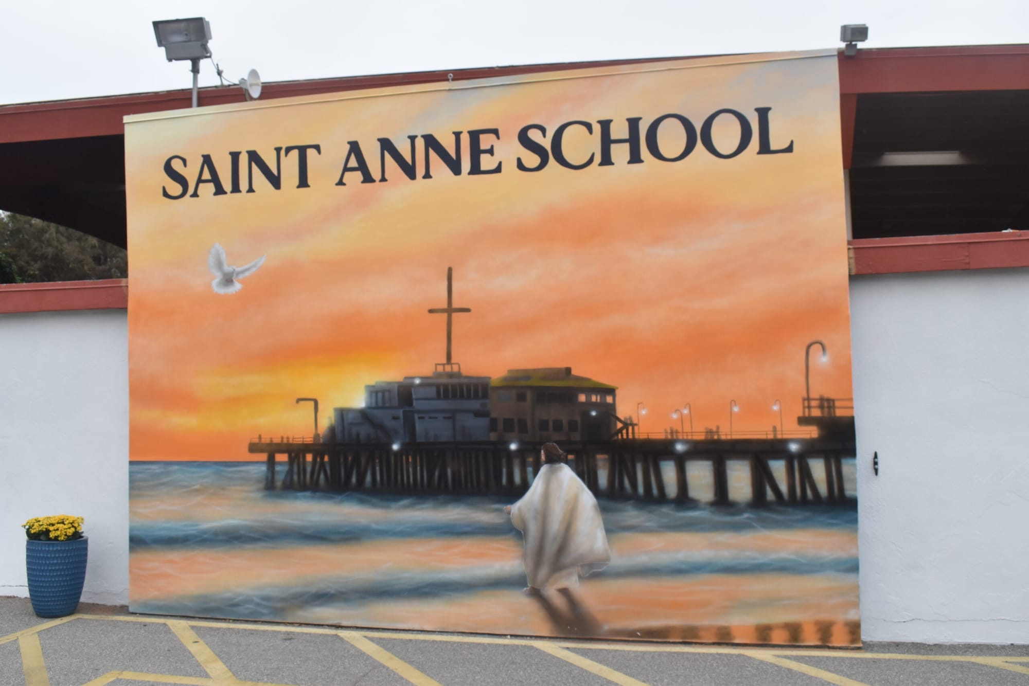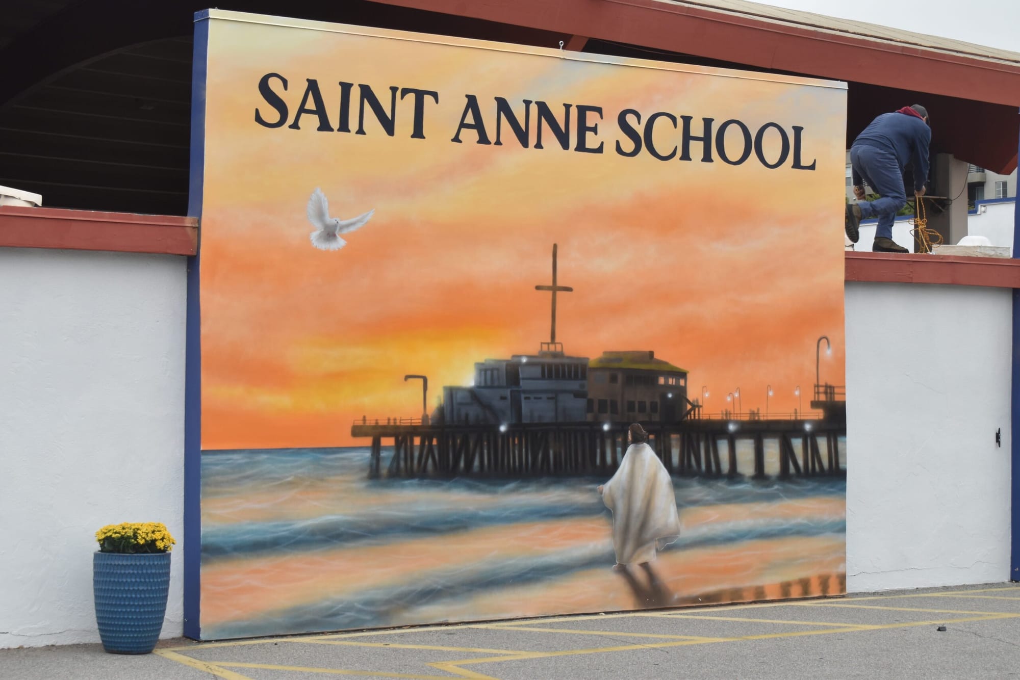 One side of the mural depicts a representation of Saint Anne cradling her child, the Blessed Mary, set against the backdrop of the Santa Monica Pier. The other side depicts Jesus Christ at the edge of the Santa Monica Beach. Zermeño had discussions about the project with Saint Anne Principal Michael Browning, who suggested what characteristics of Saint Anne he wanted emphasized.
