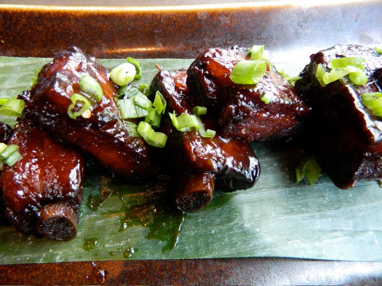 Another of the chef's thinking became more clear with the next arrival — lacquered barbecue ribs in a chili-caramel-sesame marinade. The chef likes meat more than seafood! And here no sauce on the side was needed because the ribs were well marinated in a chili-caramel glaze. And now I know even more about the chef: he likes strong flavors. These pork ribs were very sweet with crispy edges and a soft, meaty interior.