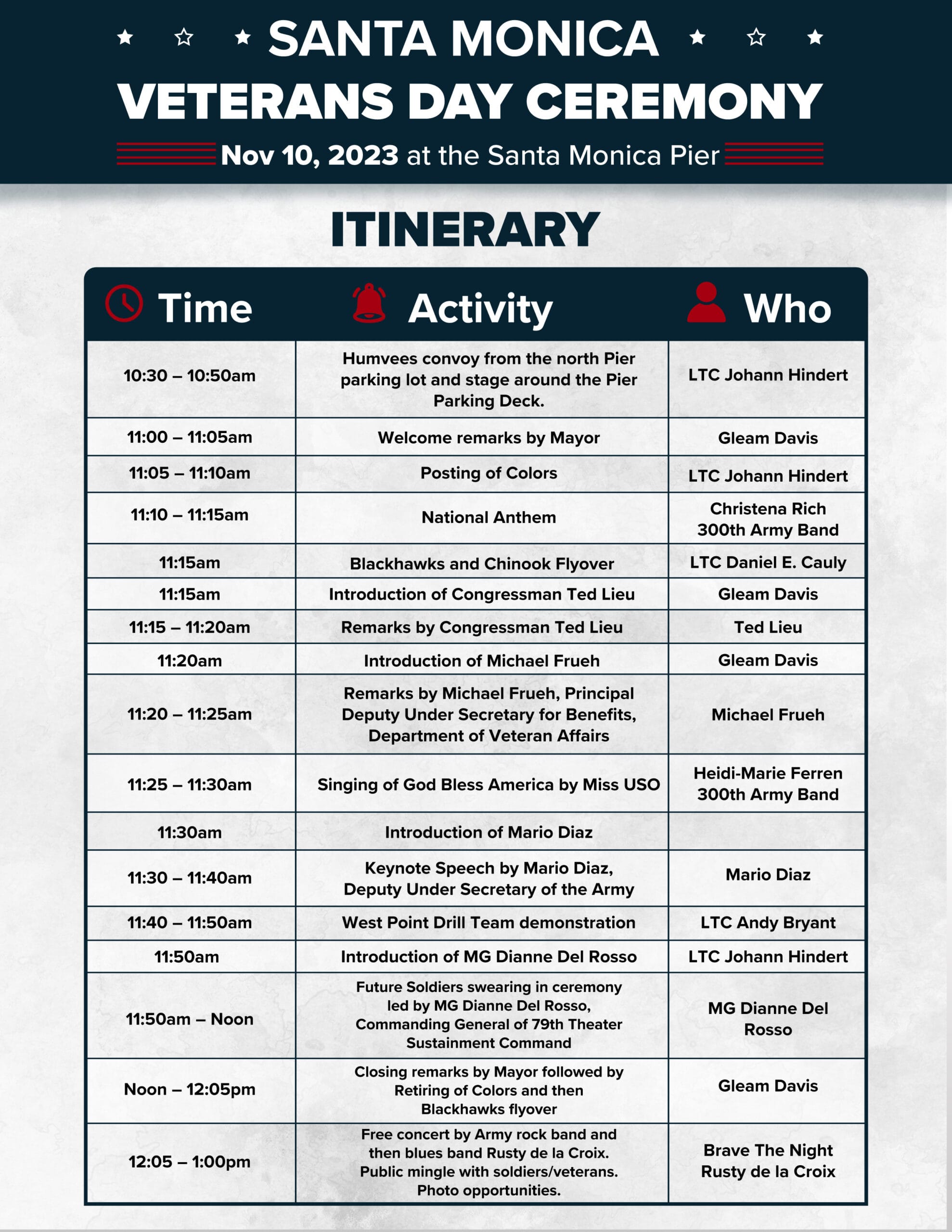 An impressive itinerary of events is in store this year, with most being held on the Santa Monica Pier. Not only will there be speeches from Mayor Gleam Davis, Congressman Ted Lieu and Deputy Under Secretary of the Army Mario Diaz, but there will be flyovers featuring Sikorsky UH-60 Black Hawk and Boeing CH-47 Chinook helicopters, a West Point drill team demonstration, plus live music and even the chance to win a PlayStation 5.