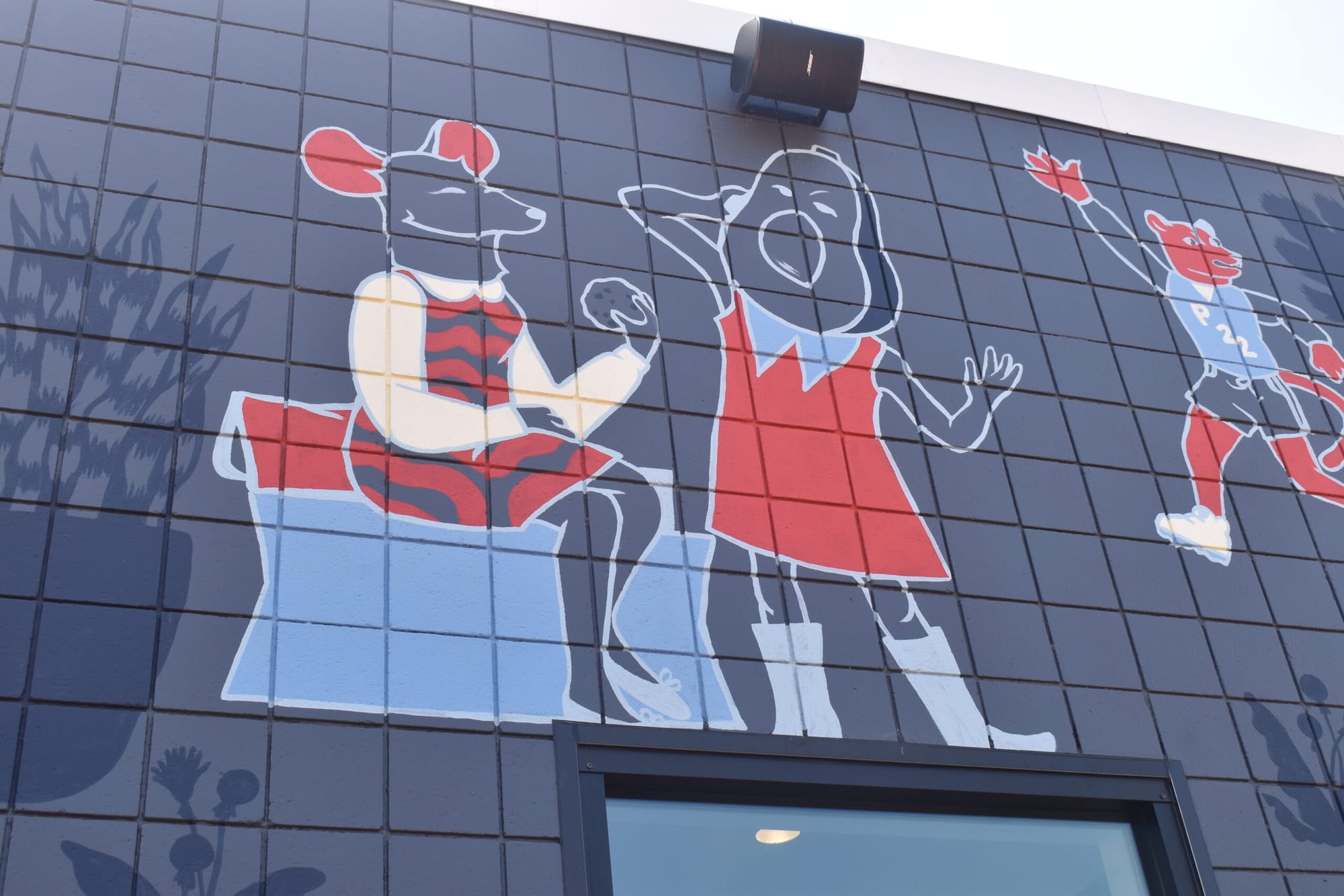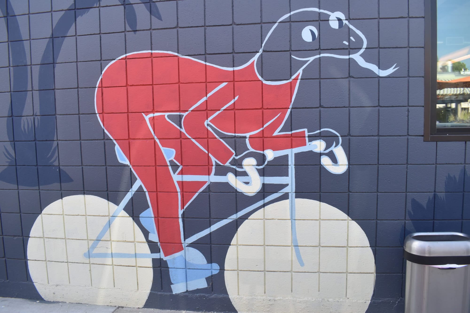 Dining can take place indoors or outdoors, with the outdoor seating facing a mural depicting several animals, created by artist Stacey Rozich.