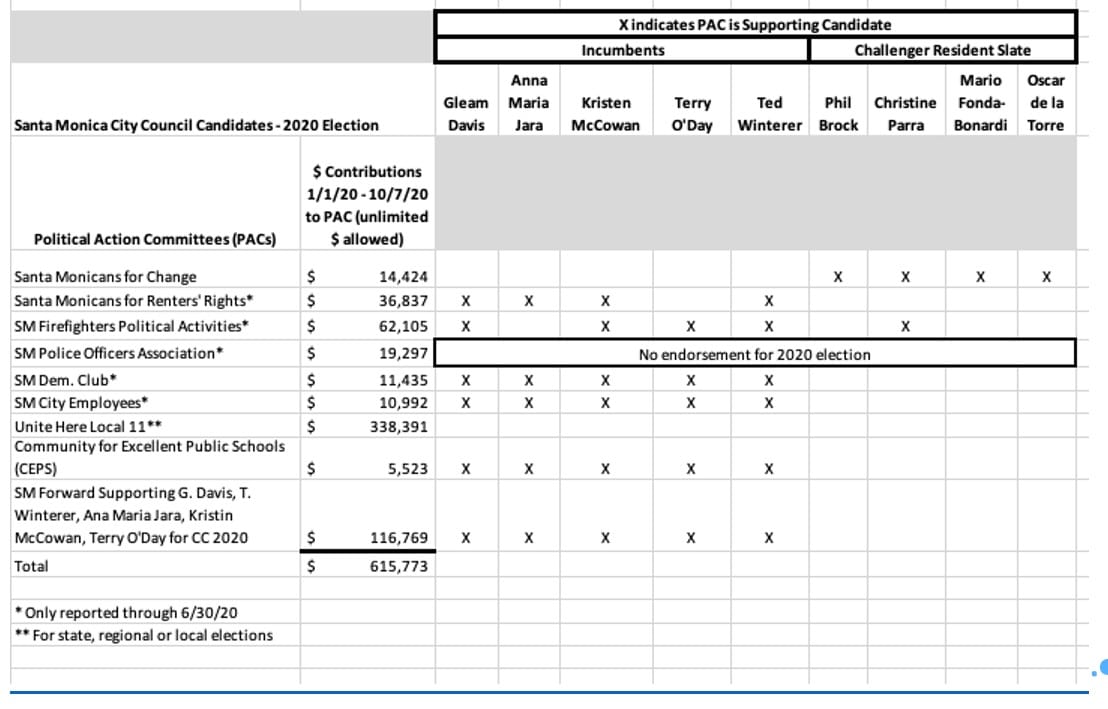 PACs focused on Santa Monica election races (Santa Monicans for Change, Santa Monicans for Renters Rights, Santa Monica Firefighters, Police and City Employees, Santa Monica Democratic Club, Community for Excellent Public Schools, and Santa Monica Forward Candidates Committee) have raised $277,382, more than two times the individual candidates. Unite Here, the hotel workers union, has raised $338,391 to support local, regional and state candidates. Although the next required reporting date is not until the end of October, PACs must still report $1000 or more within 24 hours of receipt. Almost every day PAC reports of large contributions over $1000 are being posted on the SMVote.org website https://public.netfile.com/pub2/Default.aspx?aid=CSM