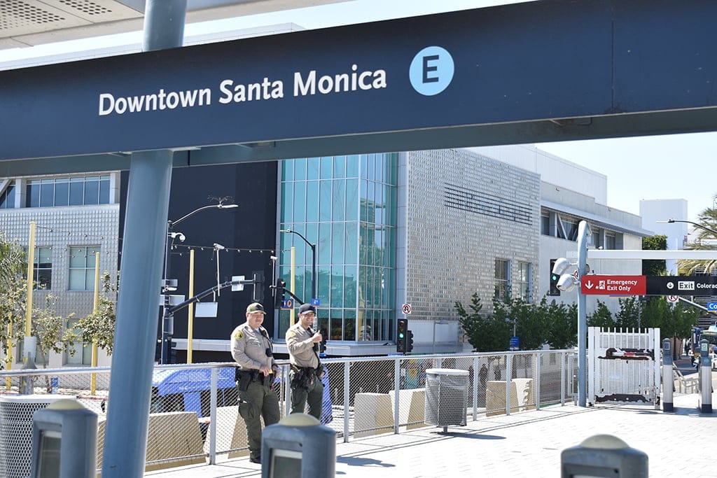 Metro rail and bus riders have grown accustomed to seeing a range of uniformed security personnel as their commutes wind them through the greater Los Angeles area. Here on the Expo Line platform at Fourth Street, khaki-clad LASD sheriff’s deputies often congregate, sometimes with dogs to sniff train cars as they arrive from downtown LA. On rail platforms in mid-city, they may spot LAPD transit officers with silver badges and patches that read transit police. At Union Station, they may see Metro Security guards in neon vests over black uniforms.