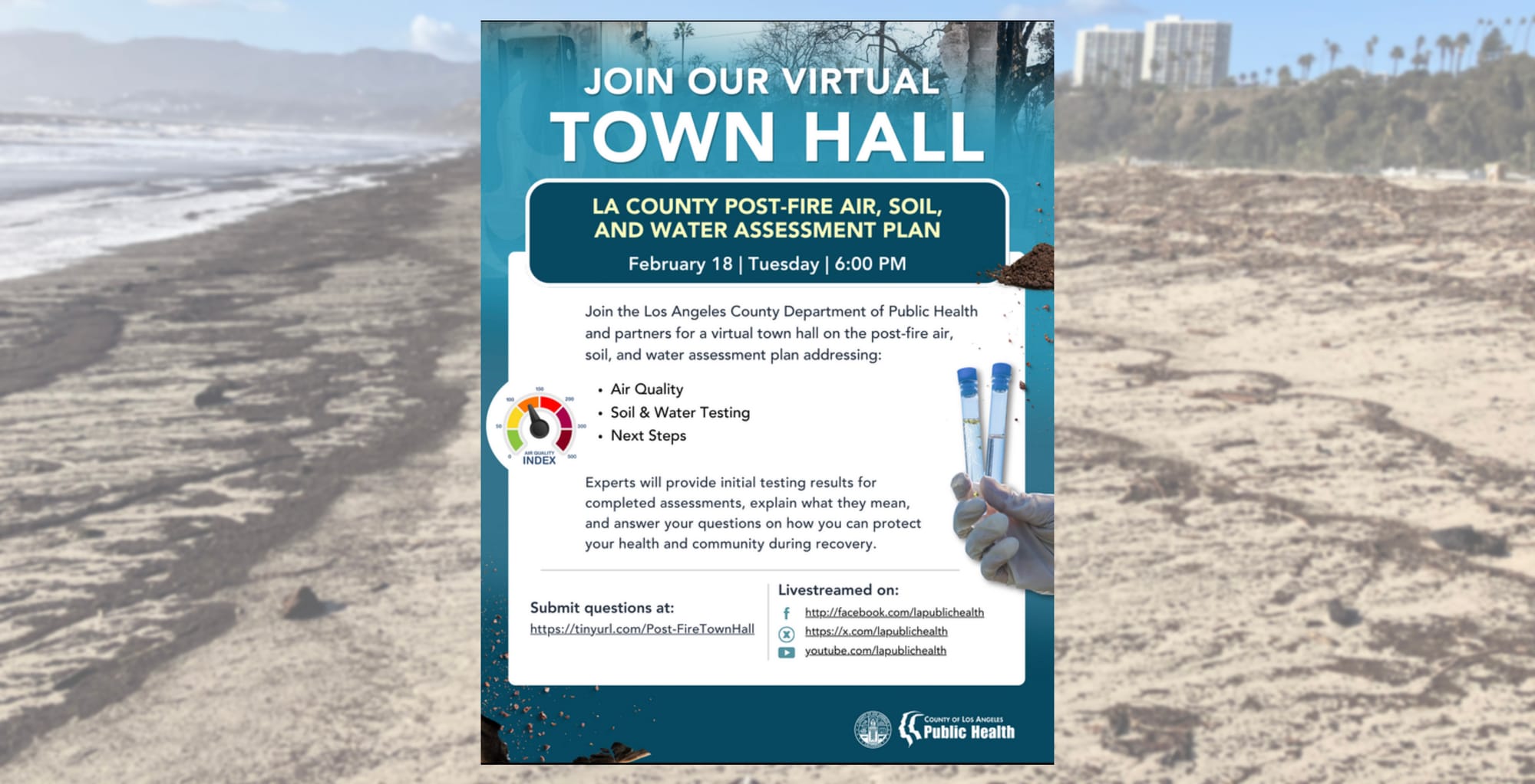Negrete has organized a virtual town on the evening of Tuesday, February 18 at 6pm where members of the Los Angeles County Department of Public Health and their partners will discuss post-fire air, soil and water assessment, including potential beach contamination. Questions can be submitted at tinyurl.com/post-firetownhall and the conversation will be livestreamed on facebook.com/lapublichealth and youtube.com/lapublichealth. As the flyer states, “Experts will provide initial testing results for completed assessments, explain what they mean, and answer your questions on how you can protect your health and community during recovery.”